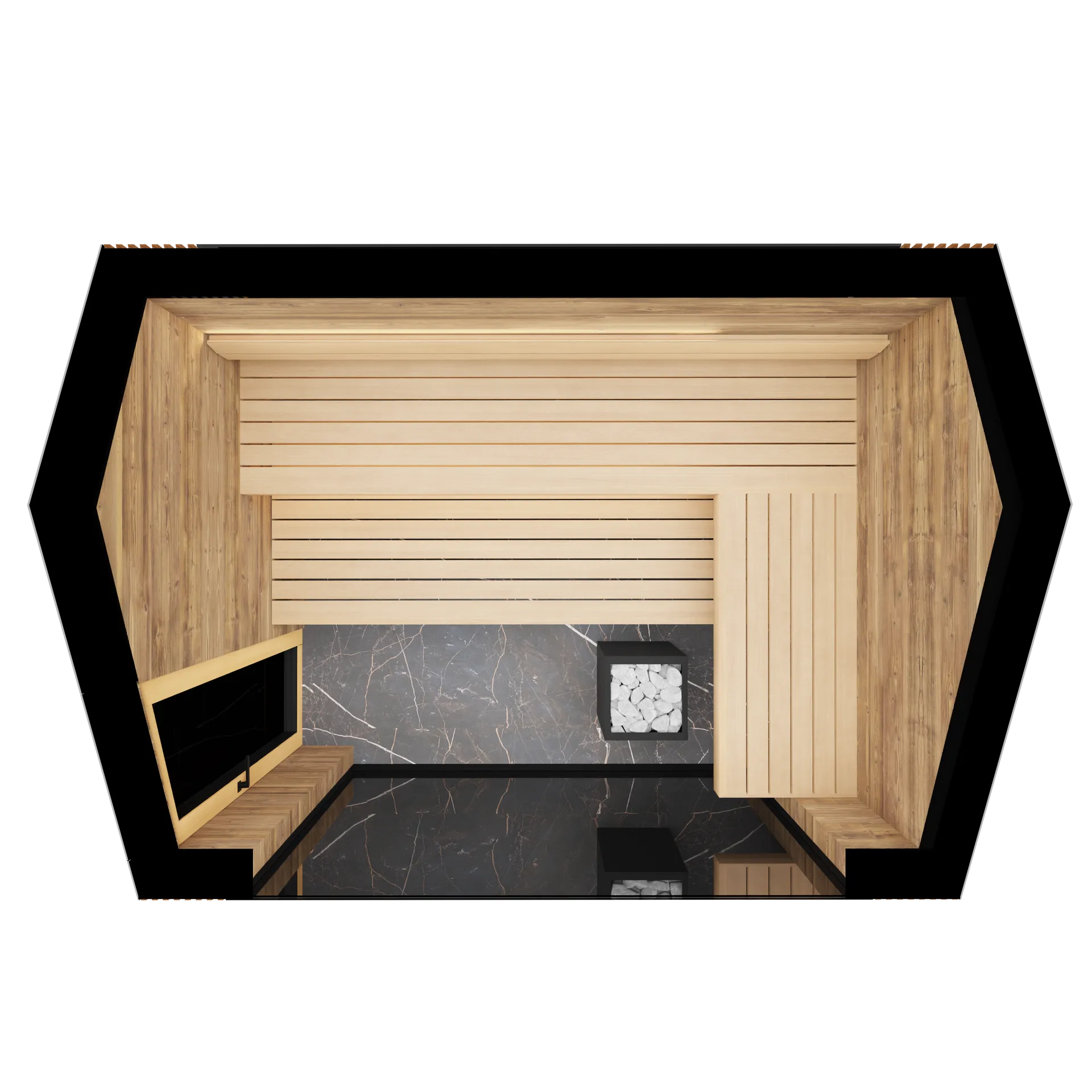 L’intérieur du sauna extérieur est conçu en bois thermo-traité (Aspen et Tyrol), assurant une résistance à la chaleur et à l’humidité, avec des bancs ergonomiques et un sol carrelé pour un entretien facilité. Le chauffage est assuré par un poêle sauna de 12 kW, permettant une montée en température rapide et homogène.